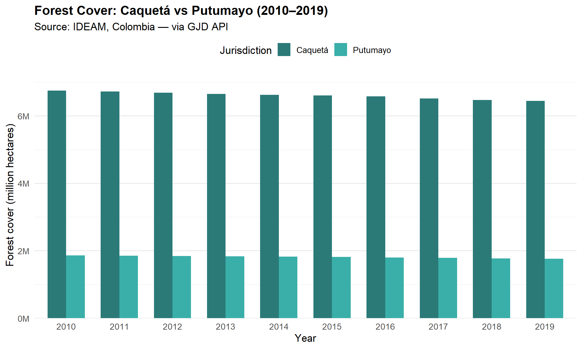 Our researcher now wants to compare Caquetá with a neighboring jurisdiction: Putumayo. Instead of making two separate requests, we can query both jurisdictions in a single API call by passing ["CO-CAQ", "CO-PUT"] as the ID_Jurisdictions parameter.