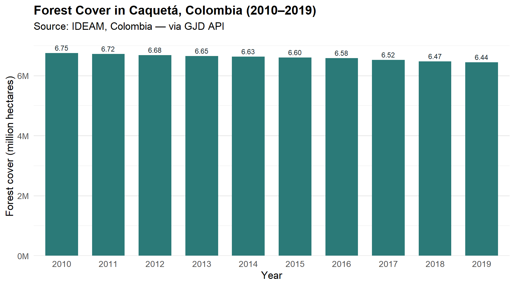 We will query forest cover data for **Caquetá** and **Putumayo** (Colombia) from **2010 to 2019**, using data published by **IDEAM** (Colombia's national environmental authority).