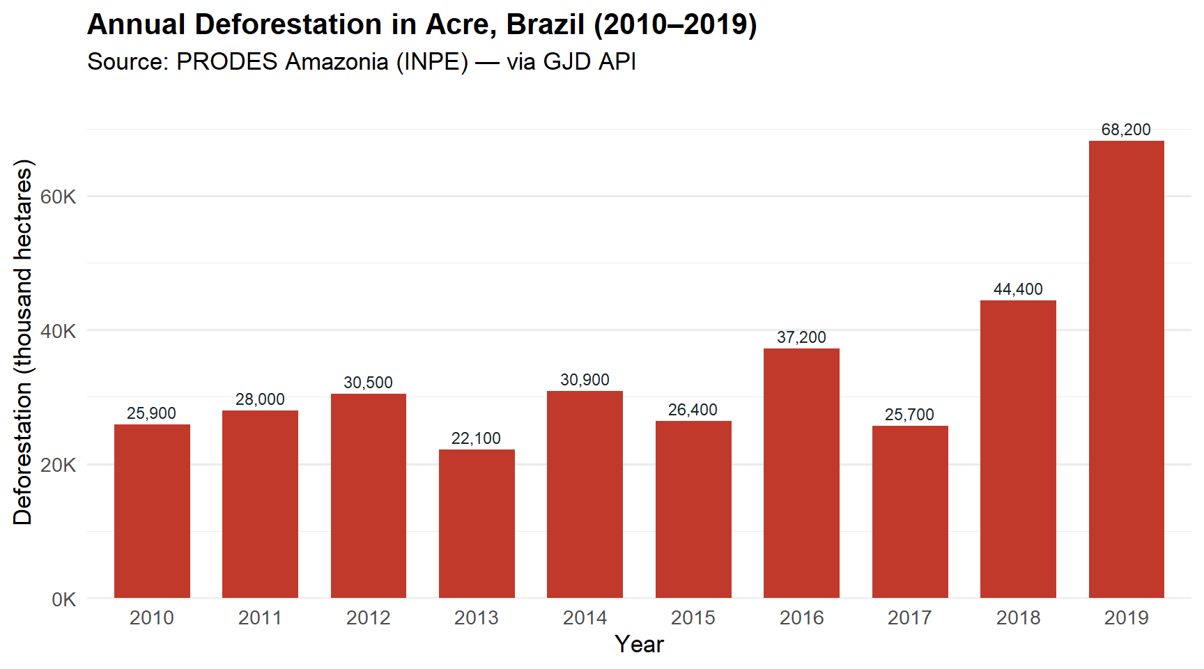 caption = "Annual deforestation in Acre, Brazil (2010–2019) — PRODES",