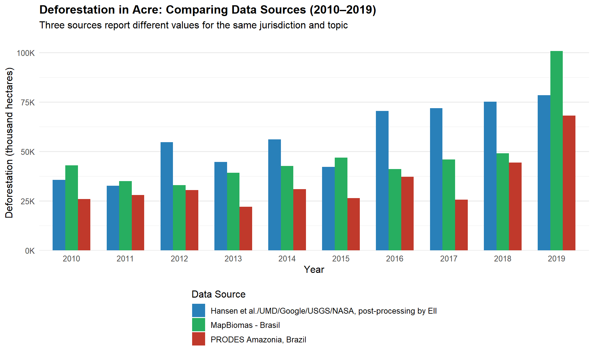 The GJD API may return data from **multiple sources** for the same topic and jurisdiction. For example, deforestation in Acre is reported by PRODES, Hansen/UMD/Google, and MapBiomas — each using different methodologies and yielding different values. By specifying `ID_sources=[12]`, we ensure we only get PRODES data for consistency.
